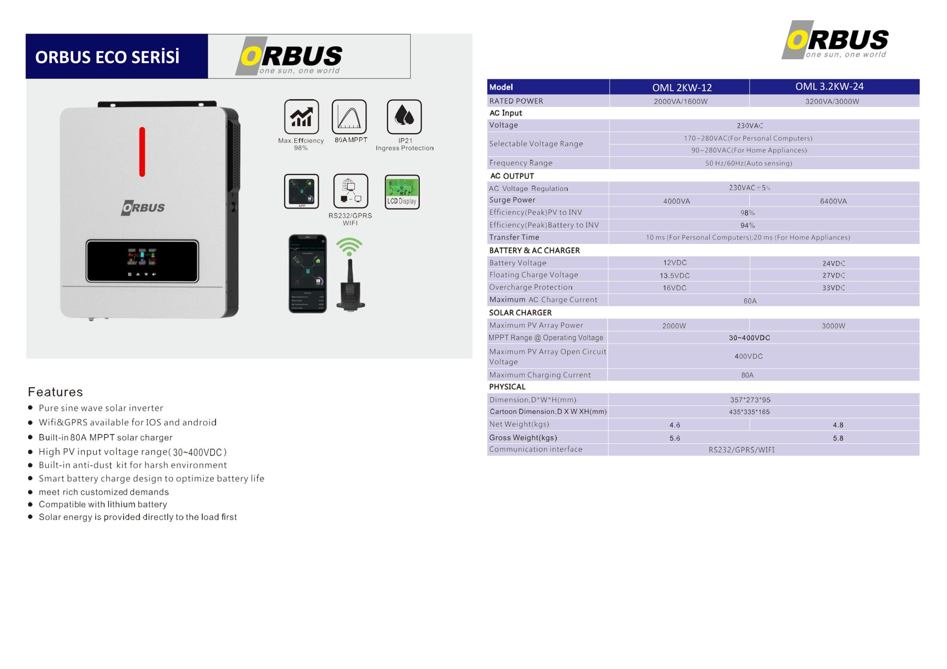 ORBUS ECO 3 kW 24 V Mppt Akıllı İnverter Teknik Özellikler