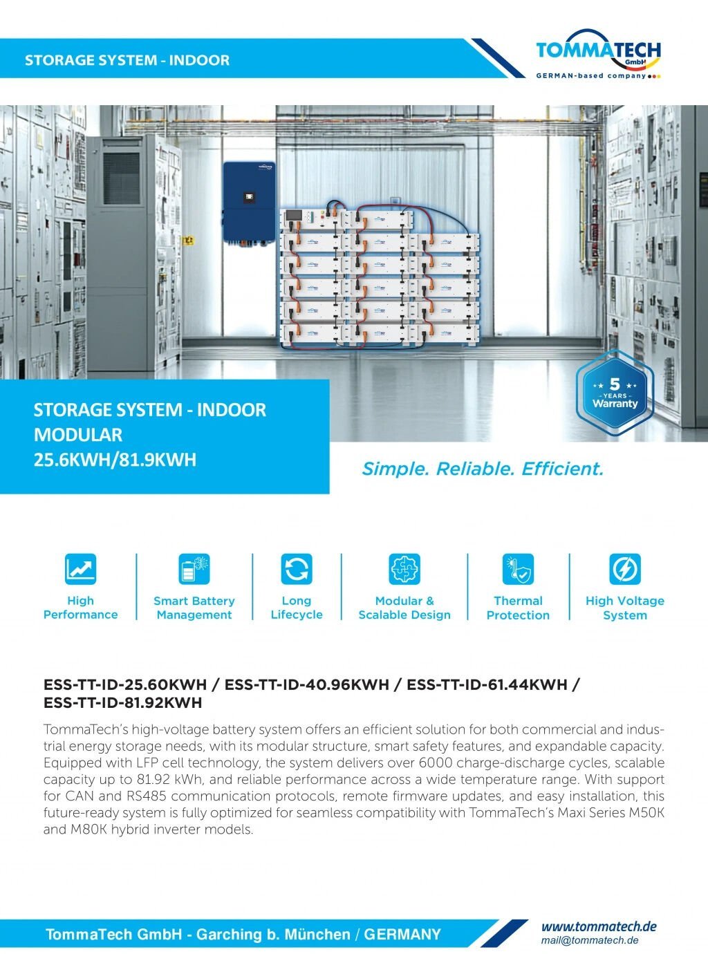 TommaTech’in gelişmiş LFP hücre teknolojisi ile üretilen bu sistem, hem ticari hem de endüstriyel enerji depolama ihtiyaçları için uzun ömürlü, güvenilir ve ölçeklenebilir bir çözümdür. 25.6 kWh’den 819.2 kWh’ye kadar genişletilebilir kapasitesi ile farklı güç gereksinimlerine uyum sağlar.