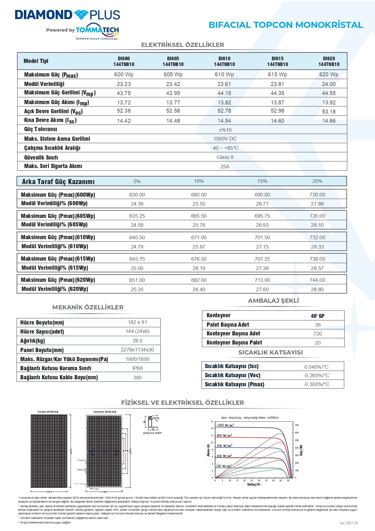 TommaTech 620W Diamond Bifacial Half Cut TOPCon Güneş Paneli – Ürün Açıklaması TommaTech Diamond serisi 620W TOPCon panel; Half-Cut hücre mimarisi ve yüksek verimlilik odağıyla, çatı ve arazi uygulamalarında uzun vadeli enerji üretimi hedefleyen projeler için konumlandırılmıştır. Düşük ışınım koşullarında yüksek performans, dayanıklı cam/çerçeve yapısı ve 1500V DC sistem uyumluluğu ile ticari ölçekli kurulumlarda güçlü bir seçenek sunar.